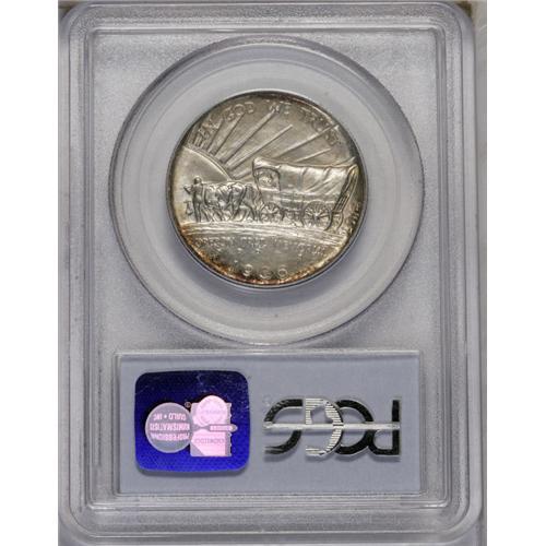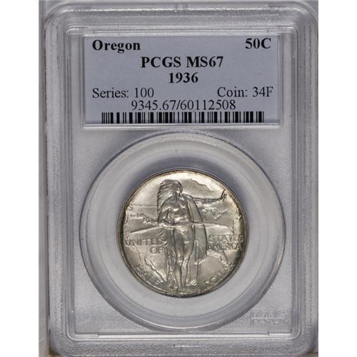 <B>1936<50C> Oregon MS67 PCGS.</B></I> Golden-brown colors congregate along the margins of this needle-sharp and satiny Superb Gem. Only a single piece has been certified in a higher grade by PCGS.