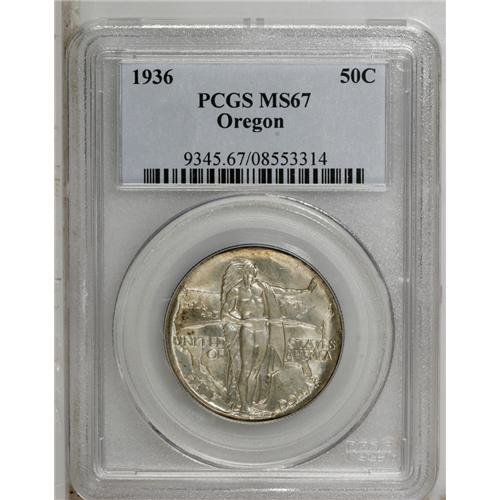 1936 50C Oregon MS67 PCGS. Highly lustrous with pale c