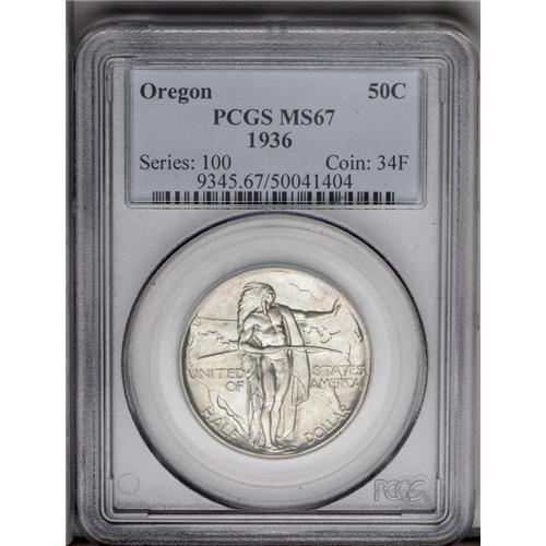 <B>1936<50C> Oregon MS67 PCGS.</B></I> Whispers of light gold-tan color occupy portions of this highly lustrous, well executed Oregon commemorative. A couple of trivial marks on the Indian's lower right (left facing) ankle do not detract in the least from this coin's overall eye appeal.