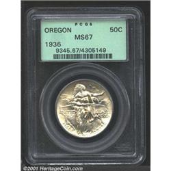 1936 50C Oregon MS67 PCGS.<p>The golden-tan patina that blankets both sides lightens somewhat toward the centers. The is a smooth, sharp looking Superb Gem. Important notice: We expect to be auctioning lots at the rate of 200-250 per hour. Sometimes eBay Premier live bid software cannot keep up with that pace, so we strongly recommend that you place a realistic proxy bid now as insurance to avoid disappointment. Also please note that all Heritage/CAA lots purchased through eBay Premier carry a 20% Buyer's Premium.