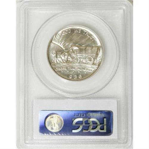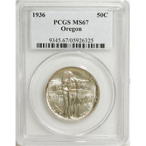<B>1936 50C Oregon MS67 PCGS.</B></I> Generally untoned save for a blush of pinkish pastel color on the Native American. Both the strike and satiny luster are what one would expect of an MS67.<BR><BR><b>Shipping:</b> Coins & Currency (<a target="_blank" href="http://www.heritageauctions.com/common/shipping.php">view shipping information</a>\)