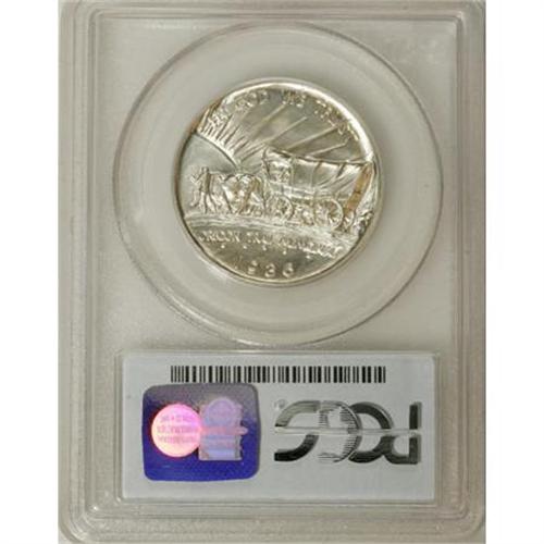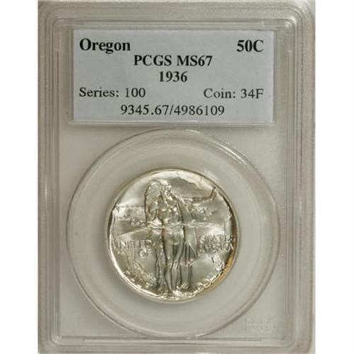 <B>1936 50C Oregon MS67 PCGS.</B></I> A fully brilliant and intricately struck Superb Gem, the frosty mint luster and attractive surfaces further confirm the imposing eye appeal. As of (8/07), NGC and PCGS have certified a total of just four pieces finer. <BR><BR><b>Shipping:</b> Coins & Currency (<a target="_blank" href="http://www.heritageauctions.com/common/shipping.php">view shipping information</a>)