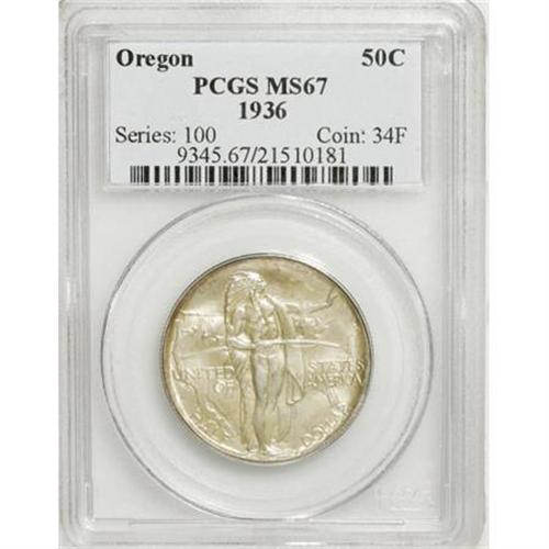 <B>1936 50C Oregon MS67 PCGS.</B></I> The shining surfaces of this Superb Gem display tan-gold patina over much of the reverse periphery, while the remainder has a few slivers of brilliance and silver-gray toning over the rest. In 1936, Oregon halves were struck at multiple mints for the first time in a decade. PCGS has graded only one coin finer (10/07).<BR><BR><b>Shipping:</b> Coins & Currency (<a target="_blank" href="http://www.heritageauctions.com/common/shipping.php">view shipping information</a>)