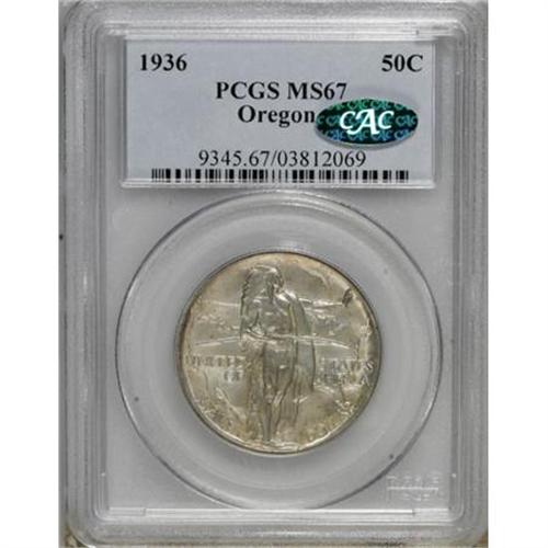 <B>1936 50C Oregon MS67 PCGS. CAC.</B></I> A satiny and solidly struck Superb Gem that offers occasional hints of green against the silver-blue of its well-preserved surfaces. PCGS has graded only one finer representative (2/08).<BR><BR><b>Shipping:</b> Coins & Currency (<a target="_blank" href="http://www.heritageauctions.com/common/shipping.php">view shipping information</a>)