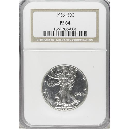 <B>1936 50C PR64 NGC.</B></I> This near-Gem proof is highly reflective, and completely brilliant on the obverse, while the reverse exhibits faint milky-tan speckles under magnification. All of the design features are exquisitely delineated. Bruce Fox (1993) writes: "All proofs of 1936 were made with the second hub, featuring large stars and incised gown details at Liberty's neck. Finishes are brilliant and lack frosted devices."<BR><BR><b>Shipping:</b> Coins & Currency (<a target="_blank" href="http://www.heritageauctions.com/common/shipping.php">view shipping information</a>)
