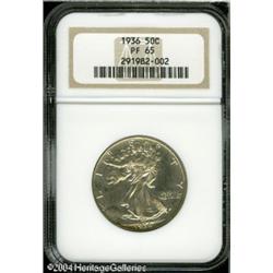 1936 50C PR65 NGC. Chestnut and sky-blue hues enri <B>1936 50C PR65 NGC.</B></I> Chestnut and sky-blue hues enrich this intricately struck and nicely mirrored Gem. The monogram and the sun's rays are attenuated, as made from lapped dies. An undisturbed representative of this low mintage, introductory proof issue. <BR><BR><B>Important notice:</B> Heritage usually auctions material at the rate of 200-250 lots per hour. On some occasions eBay Live bid software or the Internet may not be able to keep up with the pace of the auction. We recommend placing a realistic absentee bid now as insurance to avoid disappointment. Occasionally the auctioneer may eliminate or reject an eBay Live bid, and the auctioneer may also reopen a lot after the close of the eBay live bidding (usually because we missed an audience bid), and may reject your bid even if it shows you as the winning bidder. By bidding via eBay Live, you agree that Heritage may award the lot to another bidder at its sole discretion under the circumstances described above or any other reasonable circumstances. Since eBay bids are not shown to us until we open the lot on the floor, we treat those bids just like floor bids. In most cases the floor responds before the eBay bid is presented to us, due to Internet lag time, so for consistency we have made it a policy that floor bids are always considered first over tie eBay live bids. Also please note that all Heritage lots purchased through eBay Live carry a 20% Buyer's Premium. Please make sure you read the Terms and Conditions before you bid. This lot is being auctioned in conjunction with a live floor auction by Heritage Galleries & Auctioneers. All final auction and invoice information will be supplied by Heritage Galleries & Auctioneers, and all other information should be considered preliminary. Lot:6285