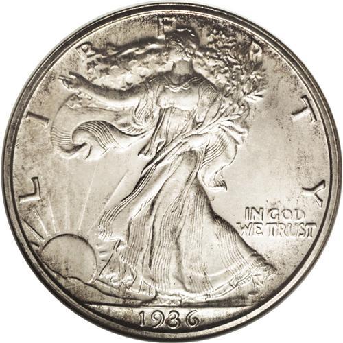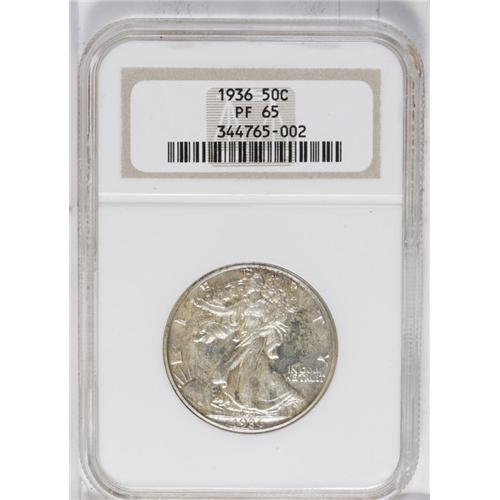 <B>1936<50C> PR65 NGC.</B></I> Full mint brilliance sparkles beneath an overlay of slightly mottled, medium intensity, golden-tan patina. Every design element rises powerfully through the toning with pinpoint striking definition. Undeniably original with carefully preserved surfaces.