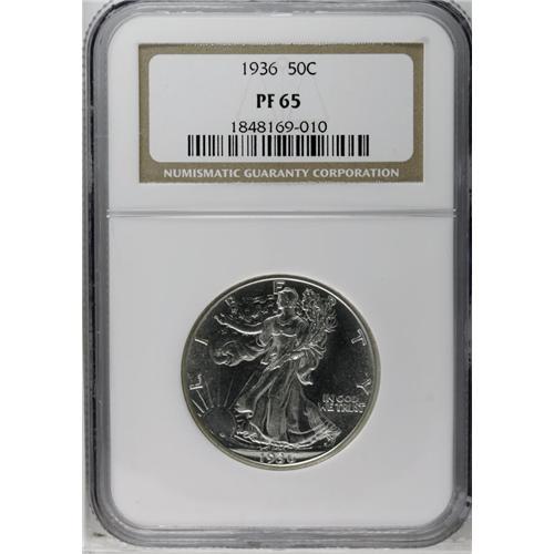 <B>1936<50C> PR65 NGC.</B></I> Fully struck and exquisitely preserved, this Gem proof Walker has a pleasingly bright, glassy appearance and brilliant surfaces that display frosty-white devices and ice-blue fields. A small degree of cloudiness is noted on each side. Proof coinage was resumed in 1936 after a 20-year cessation that began during World War I, when resources of all kinds were in short measure.