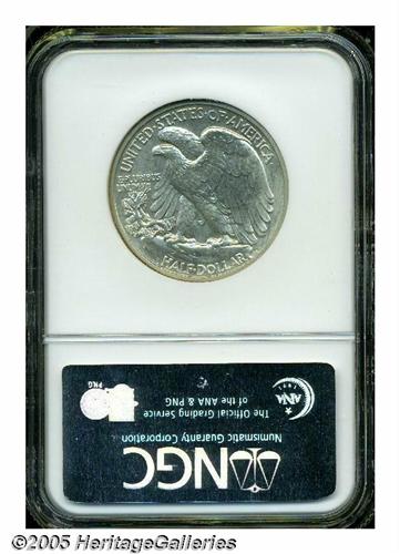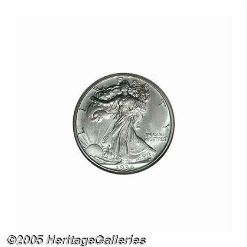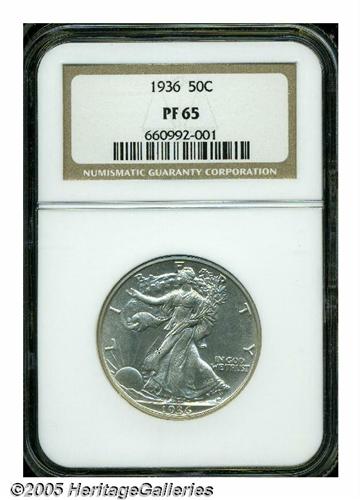 <B>1936<50C> PR65 NGC.</B></I> Light pearl-gray color graces this satiny and undisturbed proof Gem. Liberty has impressive definition on her skirt lines, branch hand, and head. Walking Liberty Halves were struck in proof format for only seven years, and the first year of issue remains the most valued, not only for its historical significance, but because it also has the lowest mintage of the series.