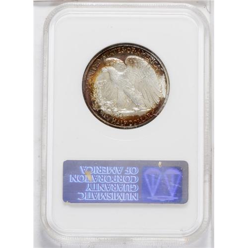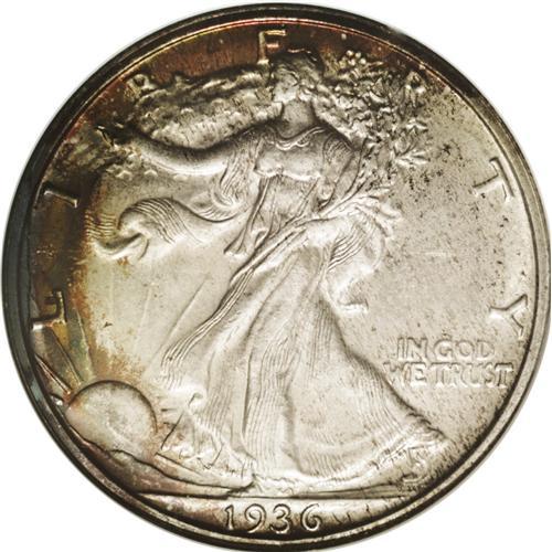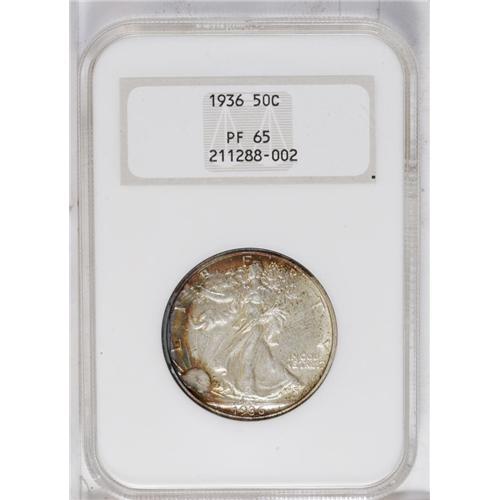 <B>1936<50C> PR65 NGC.</B></I> Lovely ruby-red, forest-green, and orange shades embrace the borders. This meticulously struck Gem is void of hairlines or contact marks, and provides exceptional eye appeal for the designated grade. The lowest mintage proof Walker date. Certified in a prior generation holder.<BR><I>From The Carolina Gold Collection, Part Four.</B></I>