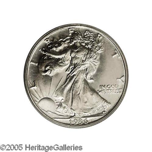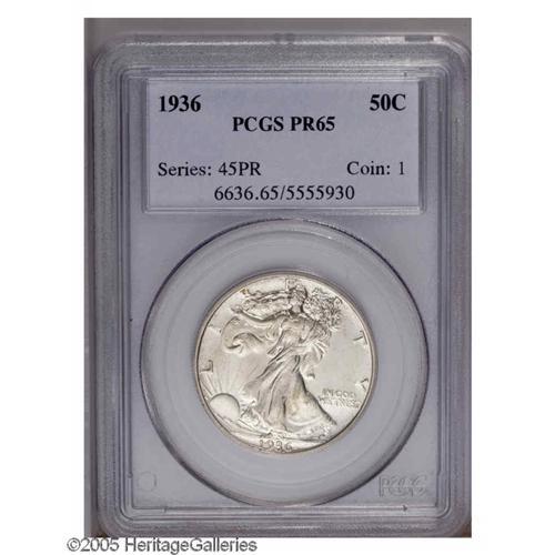 <B>1936<50C> PR65 PCGS.</B></I> First year of issue for the newly revived proof coinage, and a low mintage date that is always in demand by collectors. This is a well mirrored piece, layered in delicate gray and golden patina.