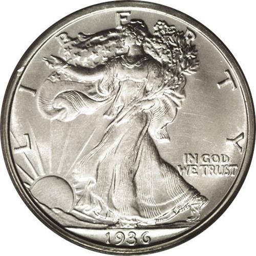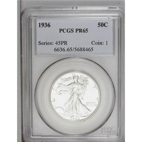 <B>1936<50C> PR65 PCGS.</B></I> Splendid striking details define the elegant design motifs. Essentially untoned, the silver-gray surfaces are nearly pristine, except for a small contact mark on Liberty's left (facing) wrist. Only 3,901 proof halves were struck in 1936, the first year of official proof production for the Walking Liberty type.