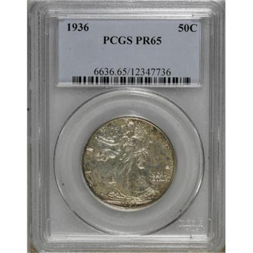 <B>1936 50C PR65 PCGS.</B></I> Bruce Fox (1993) indicates of the 1936 half dollar that: "Original coins grading Proof 65 are rare and beautiful." That description fits the current Gem, whose bright surfaces display light yellow-gold patina, joined with splashes of violet on the reverse. Impressively struck, with just a few wispy handling marks that likely preclude an even higher grade.<BR><BR><B>Coin Engraver:</B> Adolph A. Weinman<BR><BR><b>Shipping:</b> Coins & Currency (<a target="_blank" href="http://www.heritageauctions.com/common/shipping.php">view shipping information</a>)