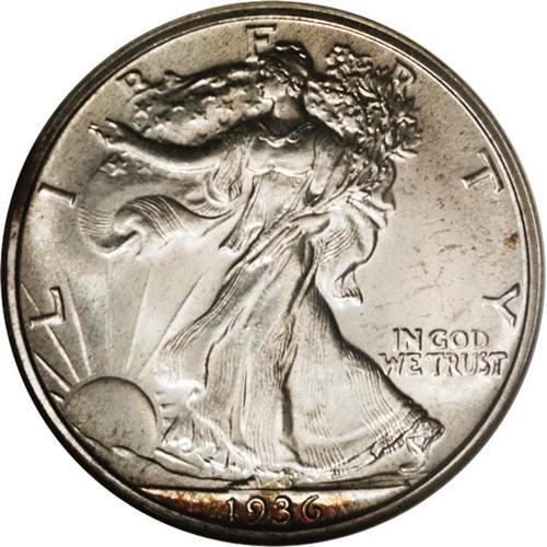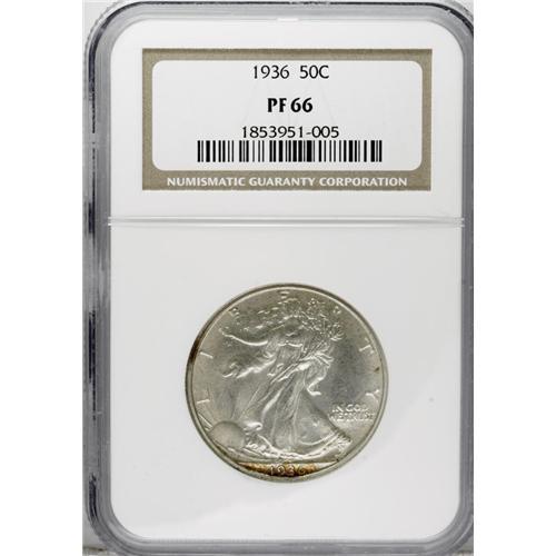 <B>1936 50C PR66 NGC.</B></I> Silver-gray surfaces take on an even distribution of tiny gold-tan speckles, that give way to a sliver of iridescent orange, crimson, and lime-green around the date area, and to some degree along a part of the left obverse rim. Excellent definition occurs on all of the design elements, and the surfaces on both sides are quite well preserved.<BR><BR><b>Shipping:</b> Coins & Currency (<a target="_blank" href="http://www.heritageauctions.com/common/shipping.php">view shipping information</a>)