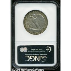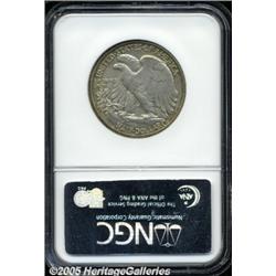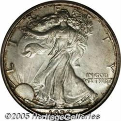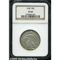 <B>1936 50C PR66 NGC.</B></I> This is the first year of wide-scale production of Proof Liberty Walking half dollars, and it is highly important to type and date collectors, as well as those working on individual Proof sets of the various years. This example is fully struck with complete design features on both sides, although the fields are not deeply mirrored. Due to a light coating of ivory and iridescent toning on both sides, this Gem has the appearance of a satin proof rather than a fully brilliant proof.