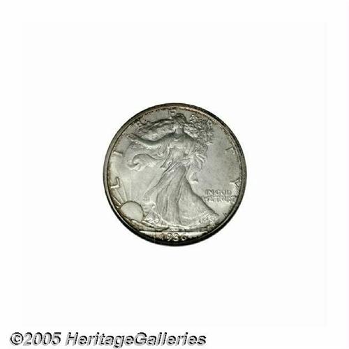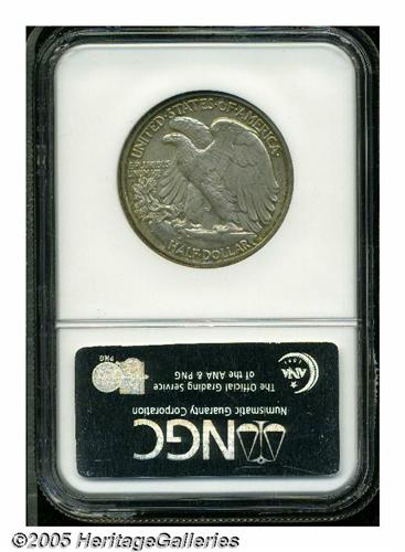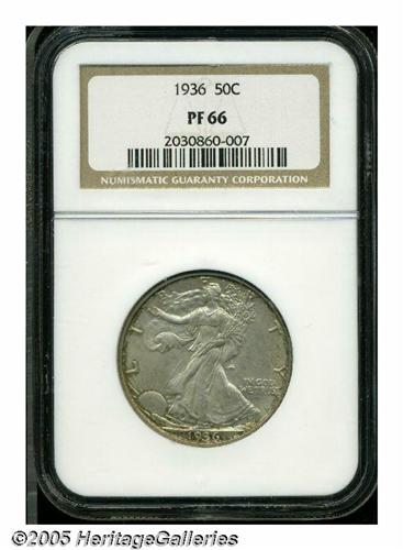 <B>1936<50C> PR66 NGC.</B></I> This is the first year of wide-scale production of Proof Liberty Walking half dollars, and it is highly important to type and date collectors, as well as those working on individual Proof sets of the various years. This example is fully struck with complete design features on both sides, although the fields are not deeply mirrored. Due to a light coating of ivory and iridescent toning on both sides, this Gem has the appearance of a satin proof rather than a fully brilliant proof.