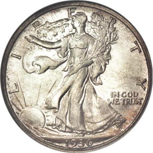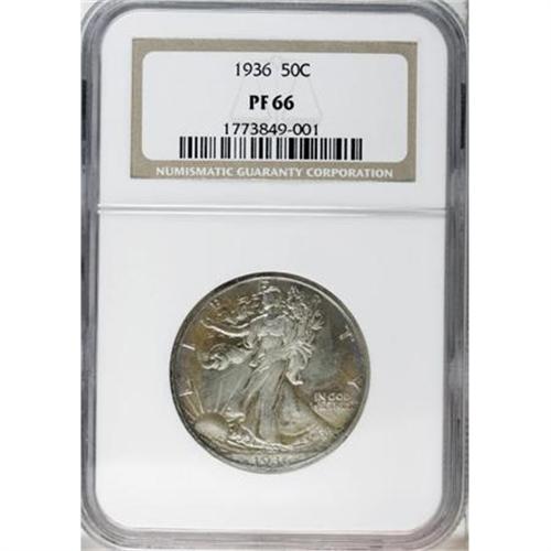 <B>1936 50C PR66 NGC.</B></I> Rarely do proof Walkers of any date appear with cameo contrast, even if it is slight. This is an exceptional example that has noticeable contrast between the devices and the fields. Mostly silver surfaces exhibit pale gray-brown and iridescent toning on both sides. NGC has only certified 19 finer examples (1/08).<BR><BR><B>Coin Engraver:</B> Adolph A. Weinman<BR><BR><b>Shipping:</b> Coins & Currency (<a target="_blank" href="http://www.heritageauctions.com/common/shipping.php">view shipping information</a>)