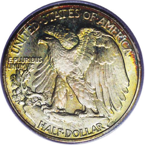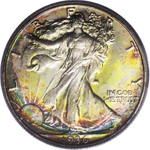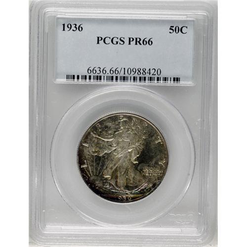 <B>1936 50C PR66 PCGS.</B></I> Both sides of this colorful proof offer lemon-yellow predominating in a color palette of rainbow iridescence that comprises violet, vivid green, and amber-gold. A couple of tiny, straight-line contact marks are noted on the highpoints of the eagle, but otherwise the surfaces are essentially pristine. PCGS has certified only 19 pieces finer (1/07).<BR><BR><b>Shipping:</b> Coins & Currency (<a target="_blank" href="http://www.heritageauctions.com/common/shipping.php">view shipping information</a>)