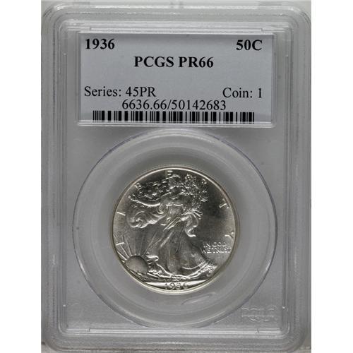 <B>1936 50C PR66 PCGS.</B></I> Fully struck with none of the weakness on Liberty's branch hand that is normally seen on business strikes. The essentially untoned surfaces are remarkably clean, and seem hairline-free on both sides. Excluding the controversial Satin-finish proofs of 1916 and 1917, this was the first official proof issue of the Walking Liberty half dollar series.<BR><BR><b>Shipping:</b> Coins & Currency (<a target="_blank" href="http://www.heritageauctions.com/common/shipping.php">view shipping information</a>)