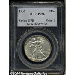 <B>1936<50C> PR66 PCGS.</B></I> White, opaque toning liberally blankets each side of this popular first year proof issue. The underlying surfaces sparkle with reflectivity and each side is fully defined. A notable specimen worthy of a fine collection. <BR><BR><B>Important notice:</B> Heritage usually auctions material at the rate of 200-250 lots per hour. On some occasions eBay Live bid software or the Internet may not be able to keep up with the pace of the auction. We recommend placing a realistic absentee bid now as insurance to avoid disappointment. Occasionally the auctioneer may eliminate or reject an eBay Live bid, and the auctioneer may also reopen a lot after the close of the eBay live bidding (usually because we missed an audience bid), and may reject your bid even if it shows you as the winning bidder. By bidding via eBay Live, you agree that Heritage may award the lot to another bidder at its sole discretion under the circumstances described above or any other reasonable circumstances. Since eBay bids are not shown to us until we open the lot on the floor, we treat those bids just like floor bids. In most cases the floor responds before the eBay bid is presented to us, due to Internet lag time, so for consistency we have made it a policy that floor bids are always considered first over tie eBay live bids. Also please note that all Heritage lots purchased through eBay Live carry a 20% Buyer's Premium. Please make sure you read the Terms and Conditions before you bid. </span></font></tr></table></td></tr></table>