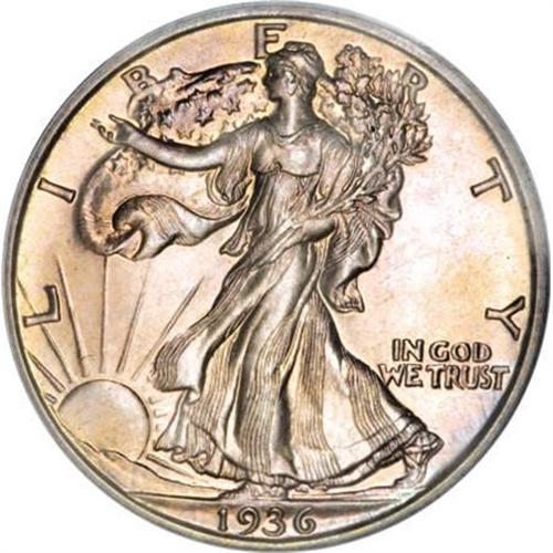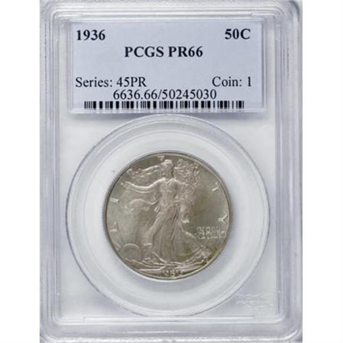 <B>1936 50C PR66 PCGS.</B></I> The champagne-gray toning and immaculate preservation of the surfaces are highlights of this lovely Premium Gem. Crisply struck, with full definition on Liberty's head and branch hand, this piece would make a worthy representative of the proof series of Walking Liberty half dollars. <BR><BR><B>Coin Engraver:</B> Adolph A. Weinman<BR><BR><b>Shipping:</b> Coins & Currency (<a target="_blank" href="http://www.heritageauctions.com/common/shipping.php">view shipping information</a>)