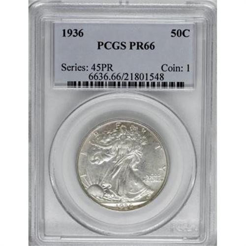 <B>1936 50C PR66 PCGS.</B></I> Both sides of this pristine specimen are deeply reflective beneath slightly mottled golden-gray patina. There are no mentionable distractions, and the devices are fully defined throughout. A high quality representative of this key, first-year proof, and one of only 3,901 pieces struck.<BR><BR><B>Coin Engraver:</B> Adolph A. Weinman<BR><BR><b>Shipping:</b> Coins & Currency (<a target="_blank" href="http://www.heritageauctions.com/common/shipping.php">view shipping information</a>)