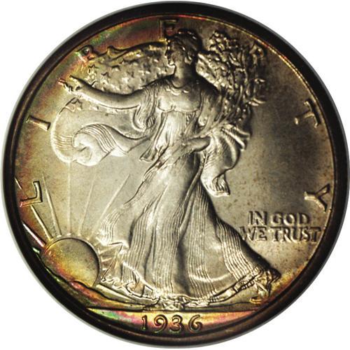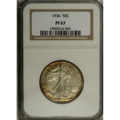 <B>1936 50C PR67 NGC.</B></I> A mere 3,901 proofs were issued in this initial year of proof production for Walking Liberty half dollar. This lower output in addition to a greater tendency for hairlines and other distractions help make the 1936 the undisputed key to the 1936-42 series of Walking Liberty proofs. Offered here is a Superb, beautifully toned specimen that exhibits crescents of orange and lime-green iridescent toning on each side. A milky gray patina occupies the balance of the peerless, well mirrored surfaces. Simply outstanding quality and desirable as such.<BR><BR><b>Shipping:</b> Coin/Currency (<a target="_blank" href="http://www.heritageauctions.com/common/shipping.php">view shipping information</a>)