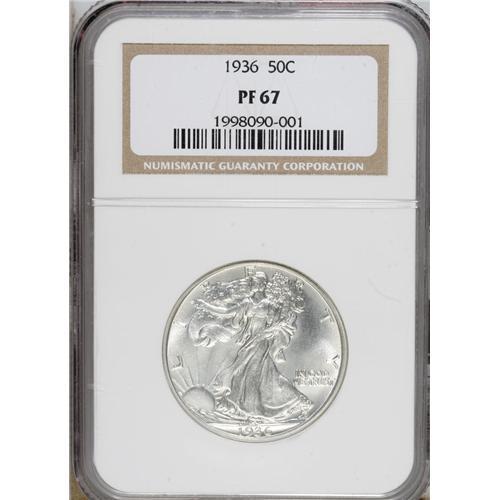 <B>1936 50C PR67 NGC.</B></I> In the early years of modern proof coinage, customers could order proof coins from the Mint individually, thus there are varying totals for the proof denominations of each year from 1936 to 1942. In the case of the 1936 proof half dollar, the Mint recorded a total of 3,901 pieces sold, while for the Lincoln cent of that year it sold 5,569 pieces, and of the Mercury dime 4,130 coins. Thus the 1936 proof half dollar is the second-rarest of the year's denominations, edged out by the 1936 Washington quarter, with 3,837 coins sold.<BR> Regardless of the mintage figure, this coin is conditionally rare and elusive, as it is one of only 63 so graded at NGC, with another 18 pieces at PCGS, and only one coin finer at either service (a PR68 at PCGS) (4/07). This example displays remarkably pristine silver-white fields that show little or no trace of color. The strike is impeccably sharp, and the preservation is equally exemplary.<BR><BR><b>Shipping:</b> Coins & Currency (<a target="_blank" href="http://www.heritageauctions.com/common/shipping.php">view shipping information</a>)