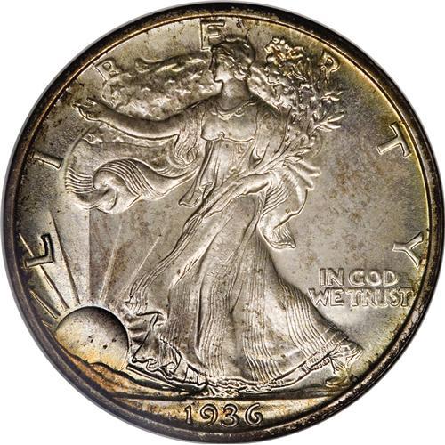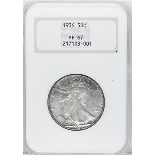 <B>1936 50C PR67 NGC.</B></I> Walking Liberty half dollars were first struck in 1916. Unfortunately for collectors, proof production was limited to cents and nickels that year, although all denominations were struck in 1915. Collectors would have to wait two decades to obtain Weinman's two coin designs, the Mercury dime and Walking Liberty half, in proof format. They were struck for 7 years, when a second World War ceased proof coinage. By 1950, when proof production was resumed, the Franklin half ruled the denomination.<BR> Among proof Walking Liberty halves, the 1936 has the lowest mintage and is key to the series. This needle-sharp, satiny, and immaculate Superb Gem is predominantly pearl-gray, although light golden-brown visits the borders. Certified in an older NGC holder.<BR><BR><b>Shipping:</b> Coins & Currency (<a target="_blank" href="http://www.heritageauctions.com/common/shipping.php">view shipping information</a>)