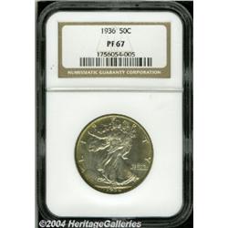 <B>1936<50C> PR67 NGC.</B></I> Many of the 3,901 proofs that were struck this year were cleaned at some time or otherwise rendered numismatically undesirable. This piece shows no distracting post-striking blemishes, but there are a few tiny mint-made lint marks on the reverse, most likely from the dies having been wiped with a cloth prior to striking. Moderately reflective, each side shows a medium coating of "oil slick" toning with somewhat deeper coloration around the rims. This date is rarely seen in such a superior state of preservation. <BR><BR><B>Important notice:</B> Heritage usually auctions material at the rate of 200-250 lots per hour. On some occasions eBay Live bid software or the Internet may not be able to keep up with the pace of the auction. We recommend placing a realistic absentee bid now as insurance to avoid disappointment. Occasionally the auctioneer may eliminate or reject an eBay Live bid, and the auctioneer may also reopen a lot after the close of the eBay live bidding (usually because we missed an audience bid), and may reject your bid even if it shows you as the winning bidder. By bidding via eBay Live, you agree that Heritage may award the lot to another bidder at its sole discretion under the circumstances described above or any other reasonable circumstances. Since eBay bids are not shown to us until we open the lot on the floor, we treat those bids just like floor bids. In most cases the floor responds before the eBay bid is presented to us, due to Internet lag time, so for consistency we have made it a policy that floor bids are always considered first over tie eBay live bids. Also please note that all Heritage lots purchased through eBay Live carry a 20% Buyer's Premium. Please make sure you read the Terms and Conditions before you bid. </span></font></tr></table></td></tr></table>