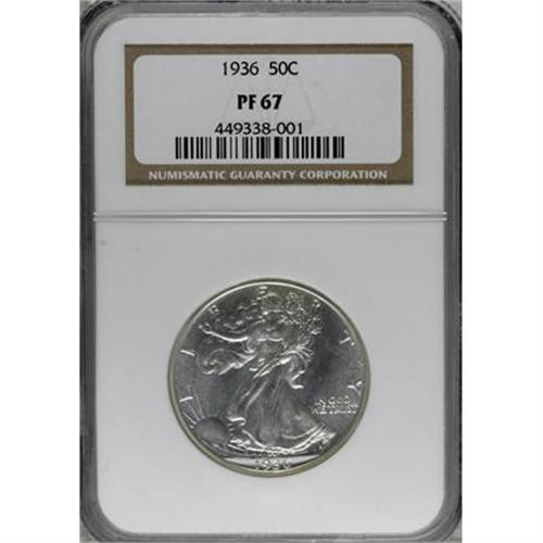 <B>1936 50C PR67 NGC.</B></I> The 1936 proof half dollar, with a mintage of 3,901 pieces, is the key to the brief 1936-1942 series of proof Walking Liberty half dollars. This inaugural issue makes regular appearances in our auctions in PR64 and PR65 grades, and even Premium Gems can be located with a little searching and patience. The PR67 offered here is quite another story. Both sides are virtually untoned, and a well executed strike has imparted exquisite detail to the design elements. Close scrutiny with a glass reveals no mentionable marks on either obverse or reverse. Census: 62 in 67, 0 finer (3/07).<BR><BR><B>Coin Engraver:</B> Adolph A. Weinman<BR><BR><b>Shipping:</b> Coins & Currency (<a target="_blank" href="http://www.heritageauctions.com/common/shipping.php">view shipping information</a>\)