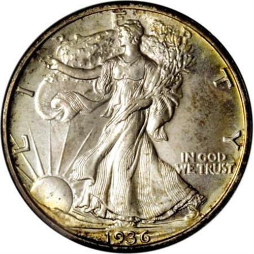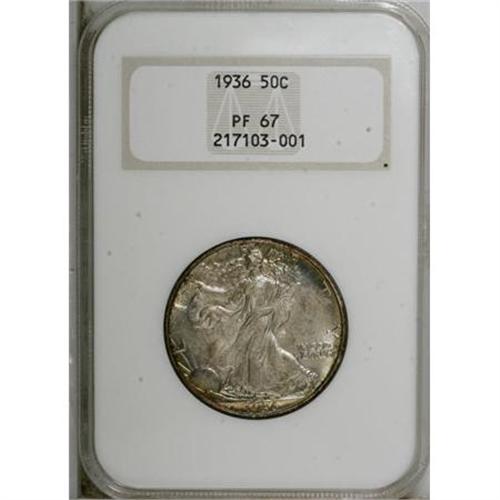 <B>1936 50C PR67 NGC.</B></I> Though Adolph A. Weinman's Walking Liberty design is an acknowledged classic, a combination of events restricted its appearance in proof format to just seven issues. The failure of matte proofs to resonate with collectors led to the collapse of the Mint's proof program in 1916, and the Walker design did not appear in proof that year. In 1936, the production of proofs continued, and the program only gained in popularity until 1942, when World War II stalled the production of such luxury pieces. By the time Philadelphia issued proof sets again in 1950, the Walking Liberty design was three years in the past.<BR> The proof half dollar issue of 1936 is characterized by an exceedingly low mintage of just 3,901 specimens, and the piece offered here is among the finest survivors. Crisply struck and carefully preserved devices emerge from cloud-gray fields with golden patina at the margins. NGC has graded no numerically higher examples, while PCGS has certified just one piece finer (9/07).<BR><BR><B>Coin Engraver:</B> Adolph A. Weinman<BR><BR><b>Shipping:</b> Coins & Currency (<a target="_blank" href="http://www.heritageauctions.com/common/shipping.php">view shipping information</a>)