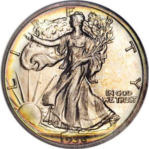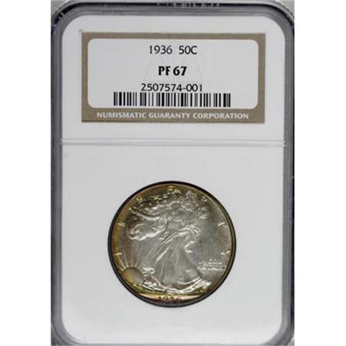 <B>1936 50C PR67 NGC.</B></I> The first proof half dollar, this Superb Gem has gorgeous rainbow toning around more than half of the obverse border, with the balance exhibiting faint gold toning. The reverse is essentially brilliant. Tied for the finest that NGC has ever certified, and exceeded by a single PCGS certified representative. Census: 64 in 67, 0 finer (1/08).<BR><BR><B>Coin Engraver:</B> Adolph A. Weinman<BR><BR><b>Shipping:</b> Coins & Currency (<a target="_blank" href="http://www.heritageauctions.com/common/shipping.php">view shipping information</a>)