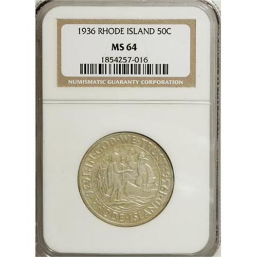 <B>1936 50C Rhode Island MS64 NGC.</B></I> NGC Census: (629/1225). PCGS Population (1027/1480). Mintage: 20,013. Numismedia Wsl. Price for NGC/PCGS coin in MS64: $100. (#9363)<BR><I>From The Frank DuVall Collection of U.S. Commemoratives.</B></I><BR><BR><b>Shipping:</b> Coins & Currency (<a target="_blank" href="http://www.heritageauctions.com/common/shipping.php">view shipping information</a>\)