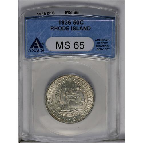 <B>1936<50C> Rhode Island MS65 ANACS.</B></I> Speckles of faint gold-tan color embrace lustrous surfaces with crisply impressed design features. A few milling marks are located on Roger Williams' arms.