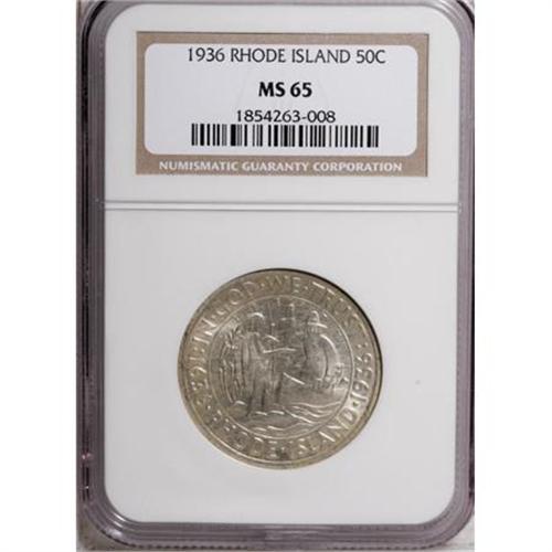 <B>1936 50C Rhode Island MS65 NGC.</B></I> NGC Census: (916/309). PCGS Population (1020/460). Mintage: 20,013. Numismedia Wsl. Price for NGC/PCGS coin in MS65: $232. (#9363)<BR><I>From The Frank DuVall Collection of U.S. Commemoratives.</B></I><BR><BR><b>Shipping:</b> Coins & Currency (<a target="_blank" href="http://www.heritageauctions.com/common/shipping.php">view shipping information</a>\)