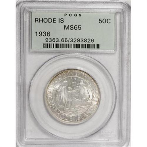 <B>1936 50C Rhode Island MS65 PCGS.</B></I> PCGS Population (1041/465). NGC Census: (928/313). Mintage: 20,013. Numismedia Wsl. Price for NGC/PCGS coin in MS65: $232. (#9363)<BR><BR><b>Shipping:</b> Coins & Currency (<a target="_blank" href="http://www.heritageauctions.com/common/shipping.php">view shipping information</a>)