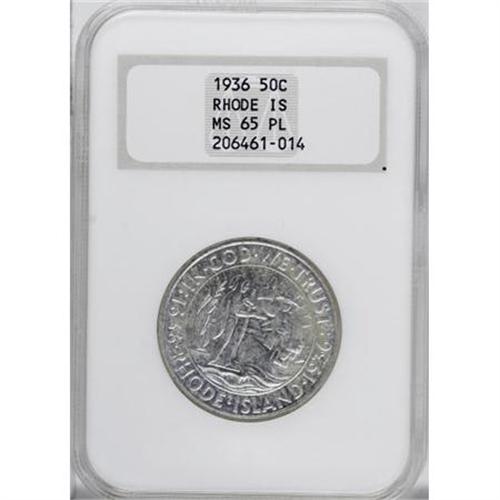 <B>1936 50C Rhode Island MS65 Prooflike NGC.</B></I> A sumptuous Rhode Island half dollar, displaying fully mirrored silver surfaces with only a faint trace of light gold color on each side, especially along the reverse border. NGC has only certified 85 prooflike 1936 Rhode Island half dollars, from a total population of 2,090 coins. Census: 44 in 65 Prooflike, 6 finer (3/08).<BR><BR><b>Shipping:</b> Coins & Currency (<a target="_blank" href="http://www.heritageauctions.com/common/shipping.php">view shipping information</a>)
