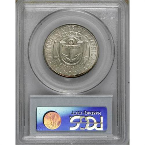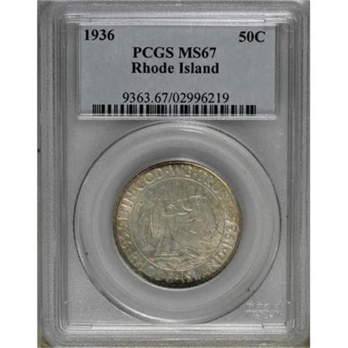 <B>1936 50C Rhode Island MS67 PCGS.</B></I> The obverse is silver-gold with iridescent jade, violet, and amber, while the reverse is largely brilliant with just a tinge of lilac at the rim. A loupe fails to reveal even the smallest distractions. Among the finest at PCGS. Population: 21 in 67, 0 finer (3/08).<BR><BR><b>Shipping:</b> Coins & Currency (<a target="_blank" href="http://www.heritageauctions.com/common/shipping.php">view shipping information</a>)