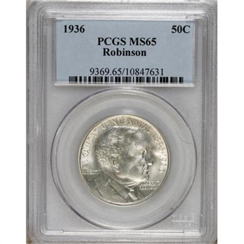 <B>1936 50C Robinson MS65 PCGS.</B></I> PCGS Population (920/426). NGC Census: (726/203). Mintage: 25,265. Numismedia Wsl. Price for NGC/PCGS coin in MS65: $400. (#9369)<BR><BR><b>Shipping:</b> Coins & Currency (<a target="_blank" href="http://www.heritageauctions.com/common/shipping.php">view shipping information</a>)