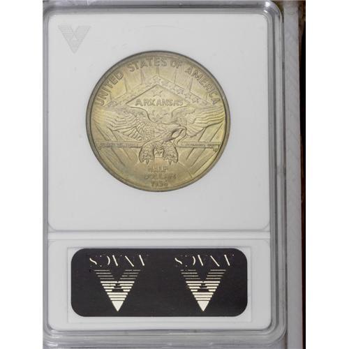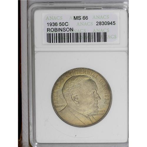 <B>1936<50C> Robinson MS66 ANACS.</B></I> Deeply blended olive and apricot patination endows this highly lustrous and unabraded Premium Gem. The strike is full aside from the highpoint of Robinson's jaw.
