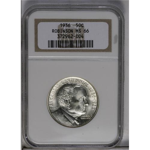 <B>1936<50C> Robinson MS66 NGC.</B></I> Each side of this remarkable Gem has satiny silver luster with full brilliance. Not a trace of toning can be found on either side. For the connoisseur of fully brilliant commemorative silver coins.