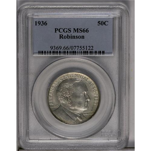 <B>1936<50C> Robinson MS66 PCGS.</B></I> Lovely pearlescent surfaces that are not only wonderfully original, but also amazingly void of any of the usual abrasions on the senator's portrait. A remarkable Premium Gem.