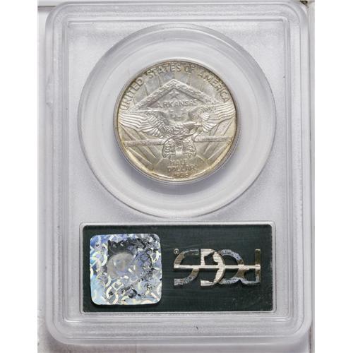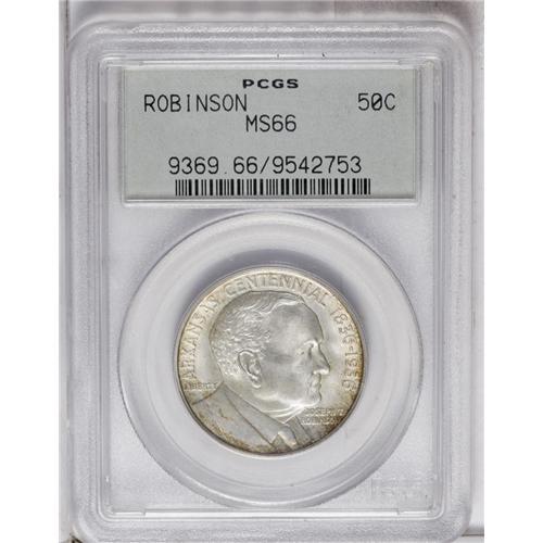 <B>1936<50C> Robinson MS66 PCGS.</B></I> Peripheral blushes of golden-tan toning enrich this lustrous and sharply struck Premium Gem. A lovely, high grade representative of this conditionally scarce type. Certified in an old green label holder.