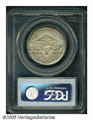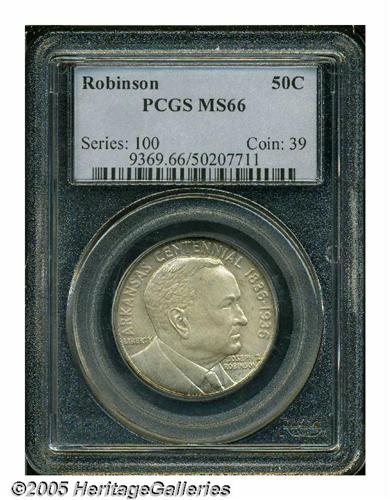 <B>1936<50C> Robinson MS66 PCGS.</B></I> This Robinson commemorative exhibits warm light gray, rose, and sky-blue patina over soft luster. All of the design elements are sharply impressed. A few unobtrusive pinscratches on Robinson's cheek are mentioned for accuracy. A couple of planchet indentions are also noted on the upper obverse. As of May 2005, PCGS and NGC combined have certified 73 coins higher.