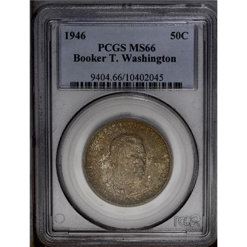 <B>1936<50C> Robinson MS66 PCGS,</B></I> attractively toned in tan-gold, olive, and ice-blue swirls; and a <B>1946 Booker T. Washington MS66 PCGS,</B></I> impressive variegated apple-green and peach patina, unusually well struck on the portrait for the type. <BR><BR><B>Important notice:</B> Heritage usually auctions material at the rate of 200-250 lots per hour. On some occasions eBay Live bid software or the Internet may not be able to keep up with the pace of the auction. We recommend placing a realistic absentee bid now as insurance to avoid disappointment. Occasionally the auctioneer may eliminate or reject an eBay Live bid, and the auctioneer may also reopen a lot after the close of the eBay live bidding (usually because we missed an audience bid), and may reject your bid even if it shows you as the winning bidder. By bidding via eBay Live, you agree that Heritage may award the lot to another bidder at its sole discretion under the circumstances described above or any other reasonable circumstances. Since eBay bids are not shown to us until we open the lot on the floor, we treat those bids just like floor bids. In most cases the floor responds before the eBay bid is presented to us, due to Internet lag time, so for consistency we have made it a policy that floor bids are always considered first over tie eBay live bids. Also please note that all Heritage lots purchased through eBay Live carry a 20% Buyer's Premium. Please make sure you read the Terms and Conditions before you bid. This lot is being auctioned in conjunction with a live floor auction by Heritage Galleries & Auctioneers. All final auction and invoice information will be supplied by Heritage Galleries & Auctioneers, and all other information should be considered preliminary. Lot:5068 <BR><BR><B>Winning Notification and Billing:</B> After the FINAL session in this auction is complete, Heritage will send e-mail and snail mail invoices. This process normally takes several days. All final auction and invoice information will be supplied by Heritage Galleries & Auctioneers, and all other information should be considered preliminary. <BR><BR>This auction will be conducted on a live auction floor and over the Internet through eBay Live. If you choose to place an absentee bid, please take a moment to <font color='#0000ff'><u><a href='http://pages.ebay.com/liveauctions/help/before/laabsentee.html'>learn how eBay Live absentee bidding works</a></u></font><font color='#000000'>