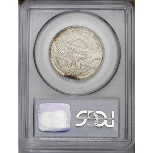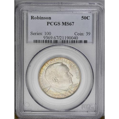 <B>1936<50C> Robinson MS67 PCGS.</B></I> This beautiful Superb Gem possesses unencumbered cartwheel sheen, and the well struck cream-gray devices are bounded by peripheral aqua, rose, and gold colors. A meticulously struck representative of this single issue type. 1936 was the high water mark of the pre-1982 commemorative series; a plethora of different half dollar types were struck that year. Population: 58 in 67, 1 finer (4/06).