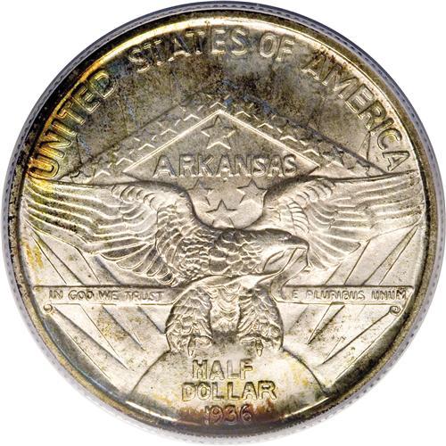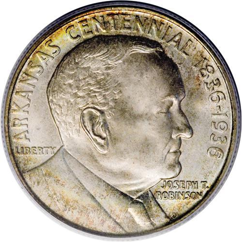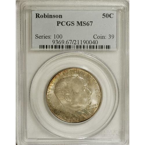 <B>1936 50C Robinson MS67 PCGS.</B></I> This beautiful Superb Gem possesses unencumbered cartwheel sheen, and the well struck cream-gray devices are bounded by peripheral aqua, rose, and gold colors. A meticulously struck representative of this single issue type. 1936 was the high water mark of the pre-1982 commemorative series; a plethora of different half dollar types were struck that year. Population: 59 in 67, 1 finer (3/07).<BR><BR><b>Shipping:</b> Coins & Currency (<a target="_blank" href="http://www.heritageauctions.com/common/shipping.php">view shipping information</a>)