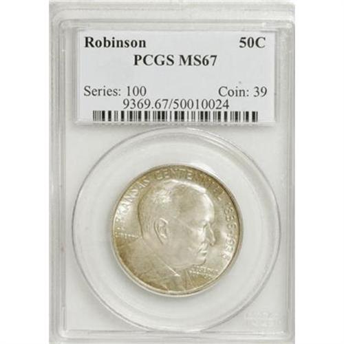 <B>1936 50C Robinson MS67 PCGS.</B></I> Though Chicago-based Edward Everett Burr and Connecticut-based Henry Kreis had only infrequent artistic contact, the two sculptors share credit for the Robinson-Arkansas commemorative half. This lovely representative has delicate silver-gray patina overall with elements of tan at the margins. Strongly lustrous with only the most minor of flaws, even when viewed under magnification. PCGS has graded just one finer example (9/07).<BR><I>From The Sterling Collection.</B></I><BR><BR><b>Shipping:</b> Coins & Currency (<a target="_blank" href="http://www.heritageauctions.com/common/shipping.php">view shipping information</a>)