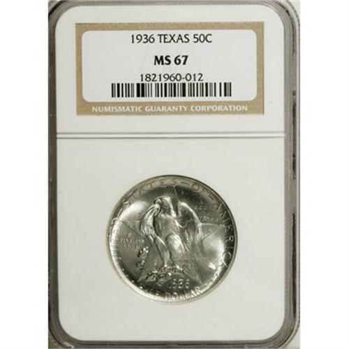 <B>1936 50C Texas MS67 NGC.</B></I> Bright mint luster swirls around each side of this impressive type coin. Not a trace of color can be found on this immaculate piece. Fully struck and nearly perfect in terms of preservation of surfaces.<BR><BR><b>Shipping:</b> Coins & Currency (<a target="_blank" href="http://www.heritageauctions.com/common/shipping.php">view shipping information</a>)